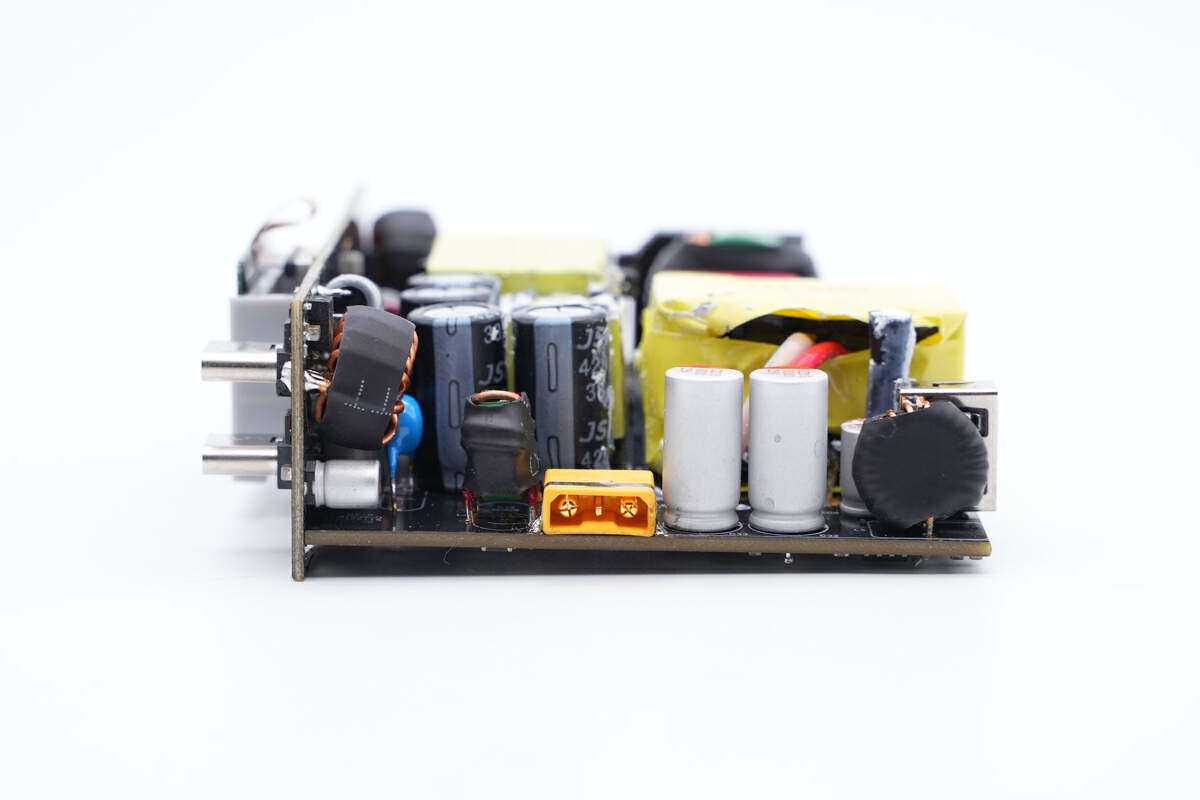 右侧上方焊接变压器,在右侧为USB-A输出接口和滤波电容,专用供电接口和滤波电感,底部PCB焊接降压电路,用于降压输出。