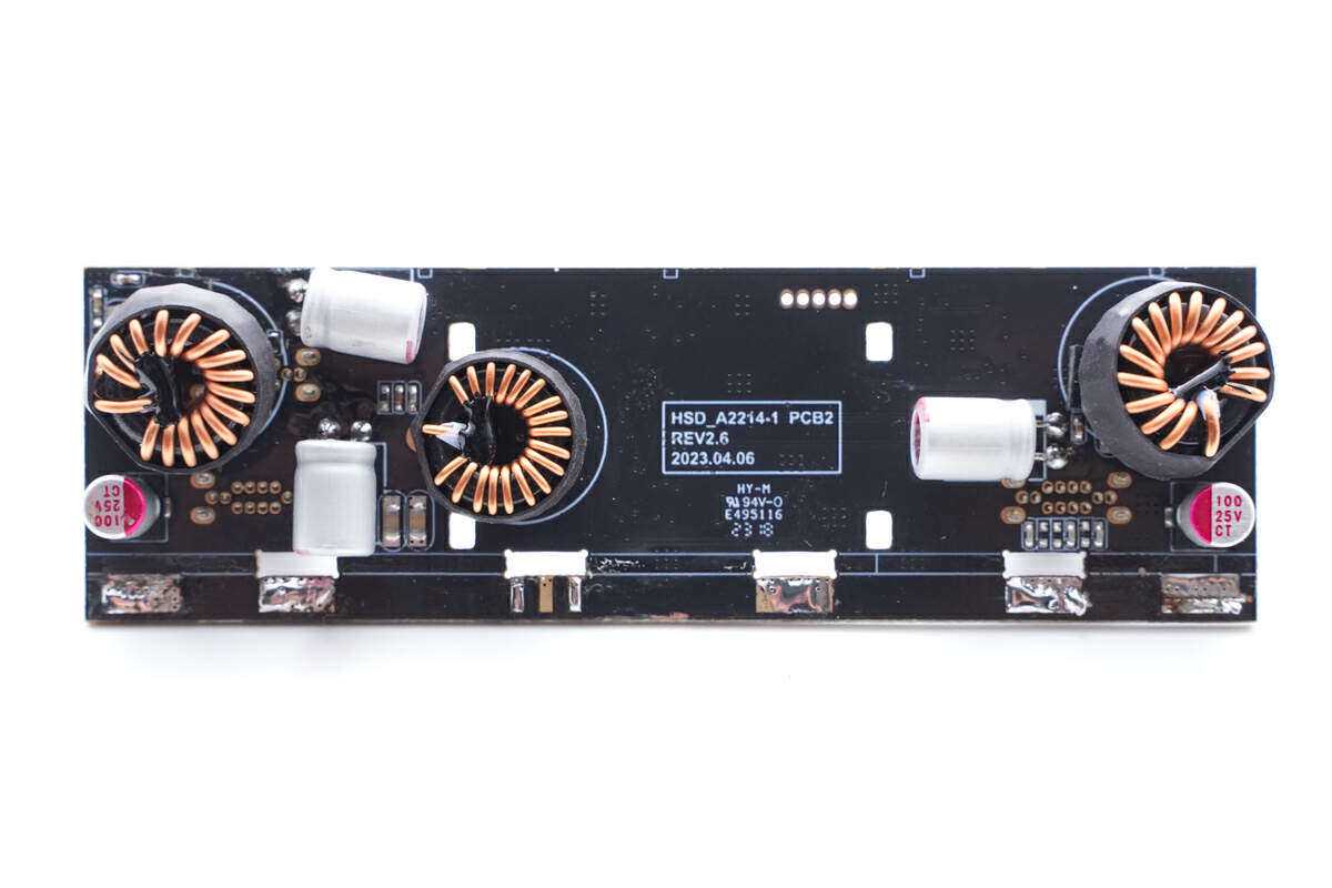 背面焊接对应三个接口三路输出的三颗降压电感以及滤波电容。