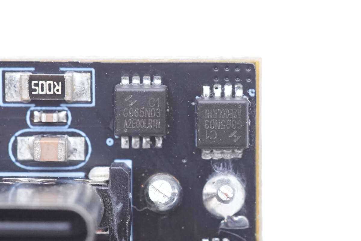 背面焊接两颗氮化镓功率芯片,两颗碳化硅二极管,LLC开关管,PFC+LLC二合一控制芯片,同步整流控制器和同步整流管。右侧下方还焊接贴片Y电容,光耦和降压芯片。