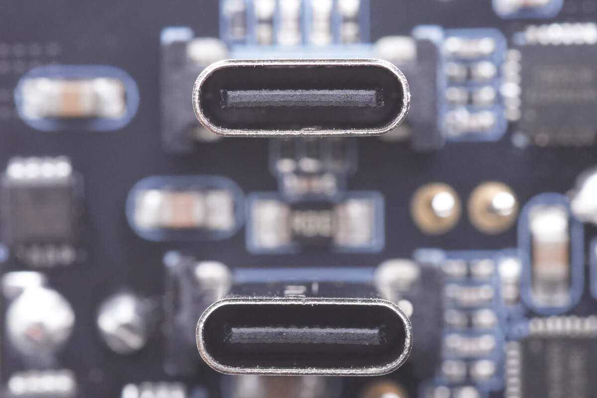 两个USB-C母座均为过孔焊接,黑色胶芯。