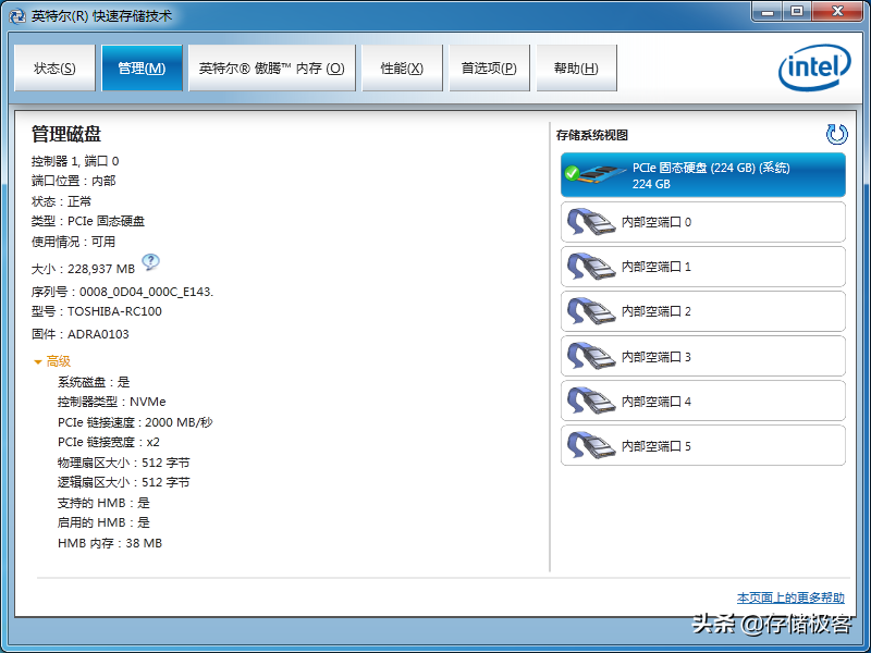 通过英特尔快速存储技术的管理面板能够看到RC100的链接速度为2000MB/s,HMB主机内存缓冲技术支持并已经开启,HMB共享了38MB的主机内存。