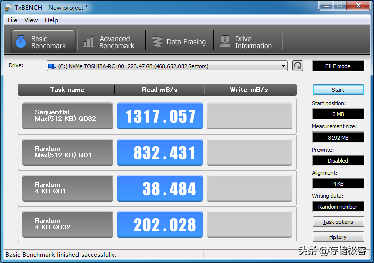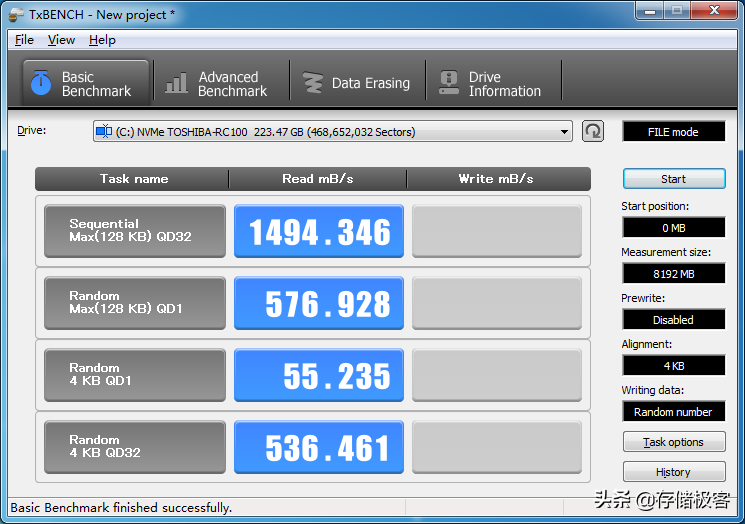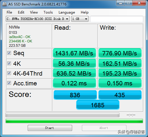 打开ASSSDBenchmark给东芝RC100进行测速,可以看到驱动名称为iaStorAC,也就是英特尔的RST模式驱动程序。测速成绩结果与Windows10下开启HMB之后的速度基本一致,Windows7老系统不支持NVMe新功能HMB的缺憾也被弥补了!
