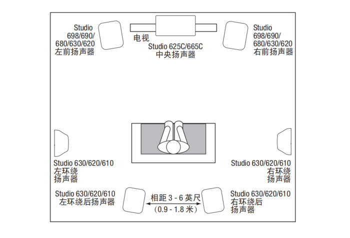 5.1声道版本的JBLSTUDIO6布置示意