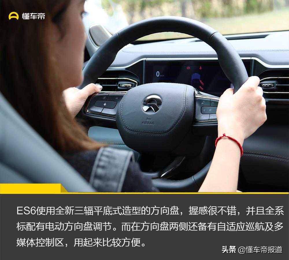 而和ES8不一样,ES6使用全新三辐平底式造型的方向盘,握感很不错,并且全系标配有电动方向盘调节。而在方向盘两侧还备有自适应巡航及多媒体控制区,用起来也比较便捷。要知道之前ES6版本车型并没有对自适应巡航开放,而量产版ES6对这项功能已经开放了,并且开启ACC跟车系统后,动能回收系统也会相应的匹配工作。