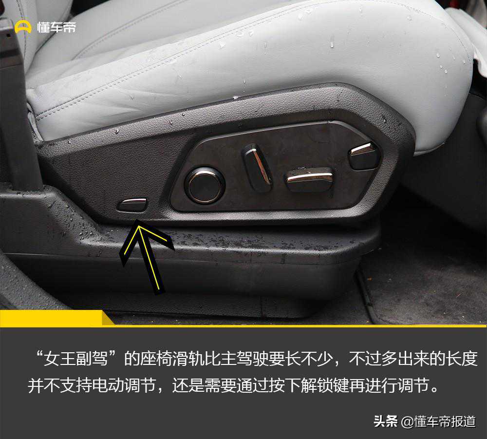 说到座椅就不得不提蔚来的“女王副驾”,这个配置在ES8车型是标配,而在ES6上只有首发纪念版配备,基准版和性能版需要8500元选装。同时,可以看出“女王副驾”的座椅滑轨比主驾驶要长不少,不过多出来的长度并不支持电动调节,还是需要通过按下解锁键再进行调节。而“女王副驾”还提供腿托和脚拖。