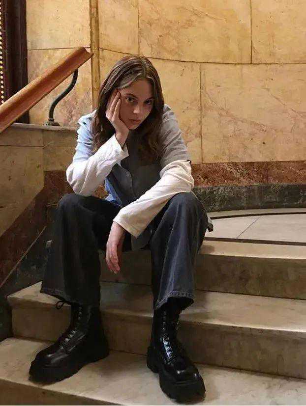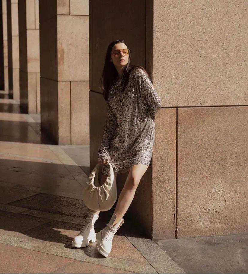 博主Karolina同样很有sense,一双印花登山靴超级吸睛,不需要复杂的搭配,用极简穿搭就能彰显时髦精本色!