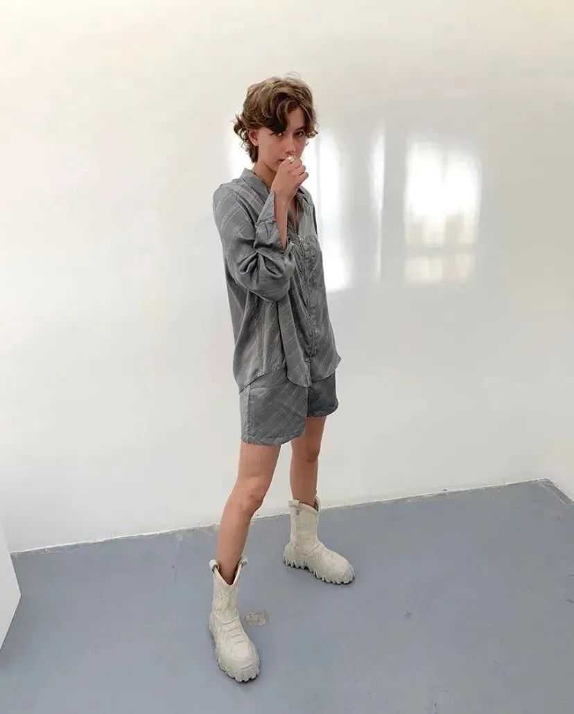 人美歌甜的澳洲小玫瑰Rosé朴彩英就在这次回归的舞台上穿了双Eytys的登山靴,一身灰色运动裙装搭配Eytys灰色麂皮系带靴,运动系辣妹的装扮真的是太美啦!