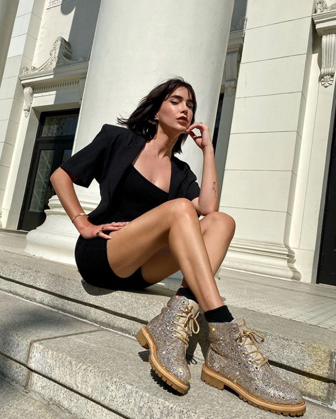 Timberland和JimmyChoo的联名靴也齐齐上阵!以“雍容华贵”为代名词的JimmyChoo自然是少不了blingbling的闪亮元素的!LadyGaga和时尚博主BrittanyXavier人手一双的JimmyChoo×Timberland就足够惹眼!整个鞋面被大小不一的水钻完全包裹,闪亮程度爆表!