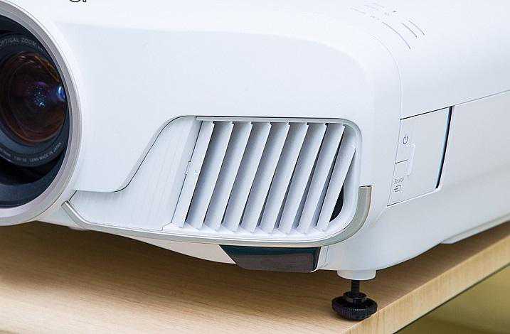这款投影仪的散热设计主要是通过镜头右侧内的风扇从风口吸入冷空间吹向内部组件之后再从左侧风口排出,而右侧风口内也有加入了防尘滤网设计,让机身内减少灰尘的堆积。