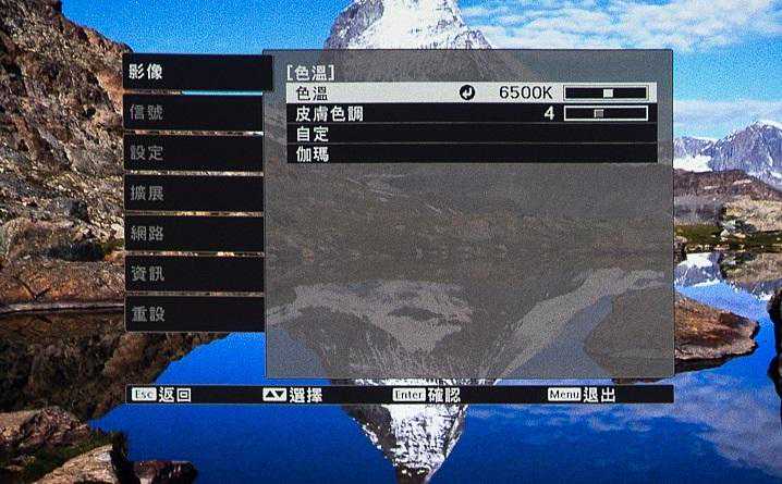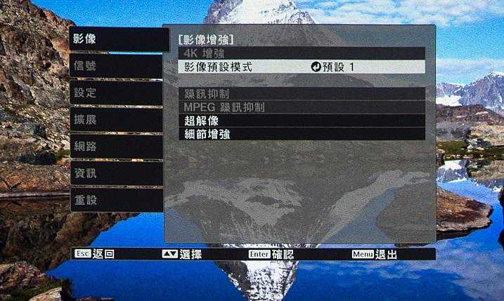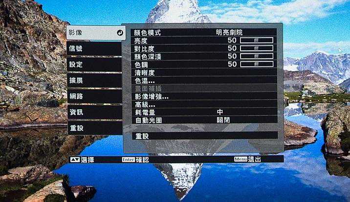 接着来看一下投影仪内建选单的部分。爱普生4KPRO-UHDEH-TW8400投影仪内建的选单主要是分成影像、信号、设置、扩展、网络、信息以及重设几个分页,其中的影像功能分页主要是可以让使用者调整内建的颜色模式、亮度对比、色温、影像增强、高级进阶色彩、耗电量以及光圈选项设置。