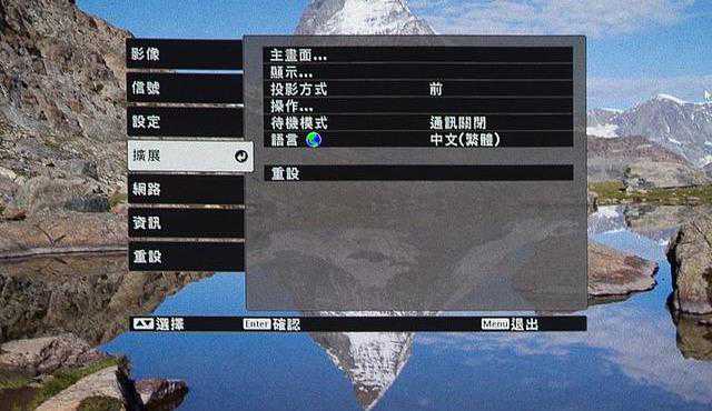 扩展选单主要是让使用者用来设置选单画面、投影方式、待机模式以及选单语言等选项。