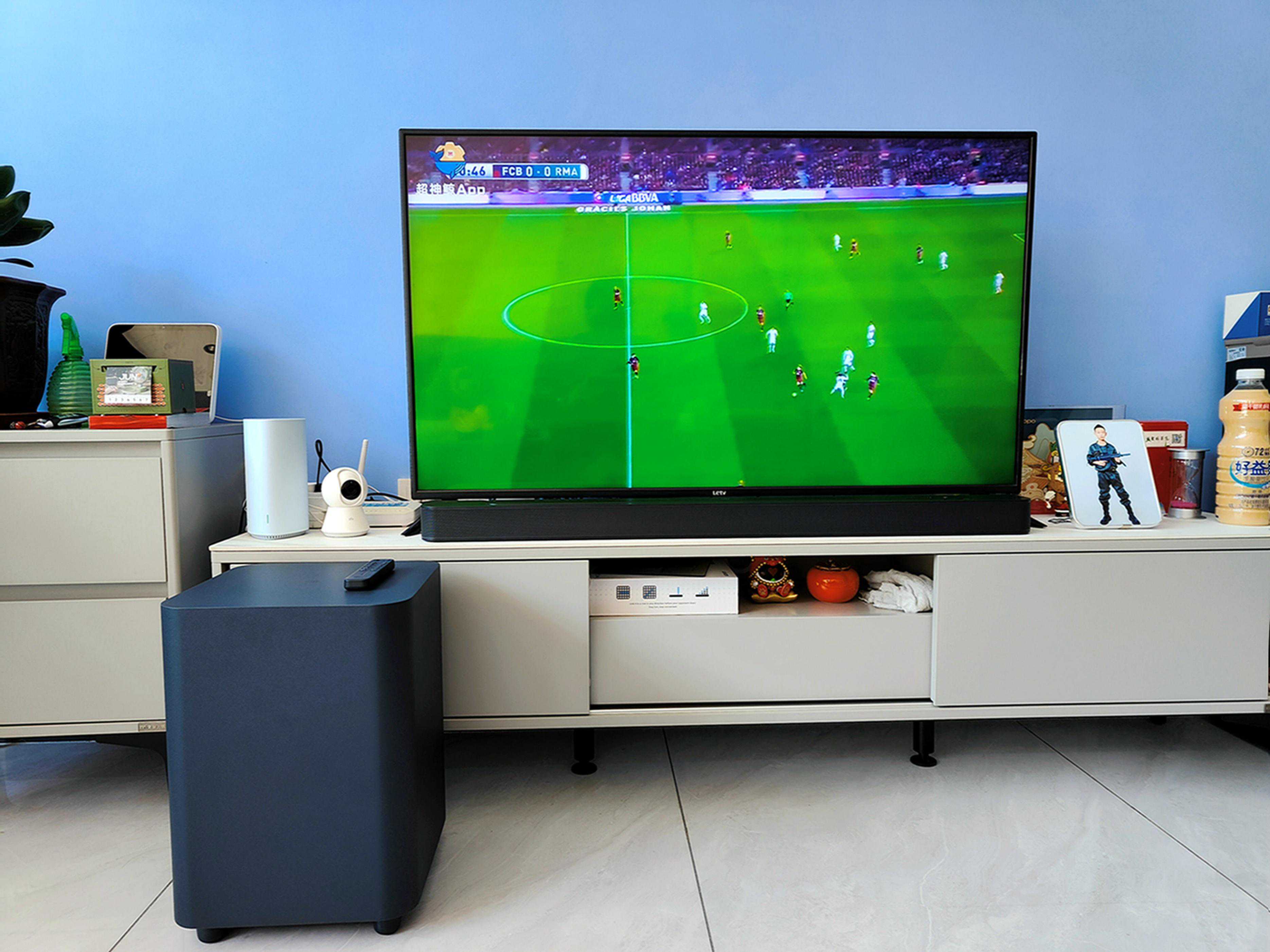 首先讲一下外观设计,简约但不失质感,这样的设计随意摆在家里都是一个加分项。音箱整体包含了回音壁、低音炮、遥控器、HDMI线以及一些挂墙配件,由于没有趁手的工具,就直接摆在了电视机下方,瞬间让家庭影院的氛围感出来了。