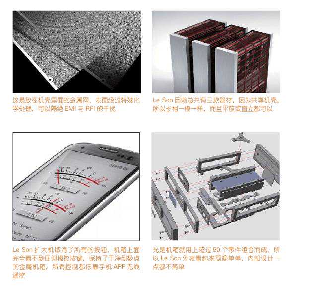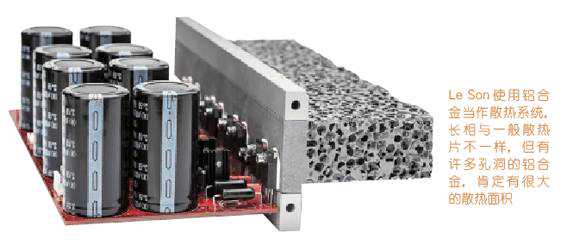 “纯粹设计”理念从外而内,LeSon器材机箱内部一样追求纯粹,以LS001串流/解码器来说,他们追求最低的时基误差,放大线路也和机箱一样有洁癖,追求最短通路、最低噪讯,同时要拥有最快的反应速度。把“纯粹设计”理念运用在机器中,未必一眼就能看出来,LS001串流/解码器主机箱是铝合金制作,从透明玻璃可以看到机壳里面有表面经过特殊化学处理的方格子,以及非常细密的金属网,借以隔绝EMI与RFI的干扰。而这个看似简单的机箱,其实由超过50个零件组合而成,在LeSon最简单的外表下,有着最复杂的结构。又如看似发泡海绵的铝合金散热系统,上面有许多细小的孔洞,都是CNC一个个挖出来的,体积很小却有很大的散热面积,在LS003单声道后级中还会加上低速静音风扇,包括在昂贵的FMAcoustics产品上,我们都未曾见过这么精细的工艺。