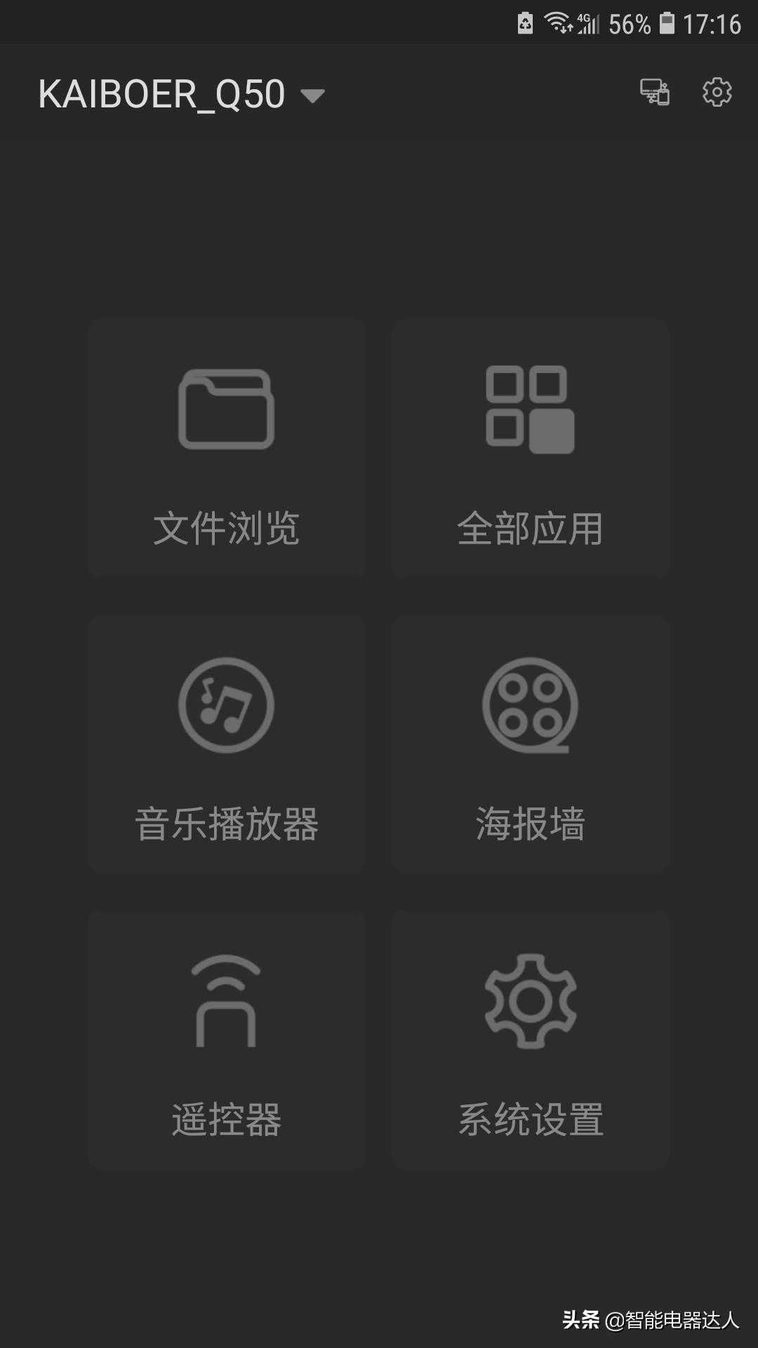 博控集合了文件浏览、全部应用、音乐海报墙(音乐播放器)、电影海报墙(海报墙)、遥控器以及系统设置功能,可以理解为播放器上所有功能在手机端的映射,通过遥控器在电视大屏上的操作都可以通过博控全部实现,非常强大。