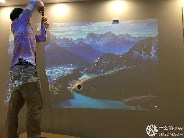 得益于抗光幕布本身的金属色,没有投影的时候,看上去也像很大的一面电视,而不会像普通的白色幕布一样看上去只是一块布。