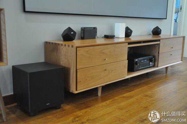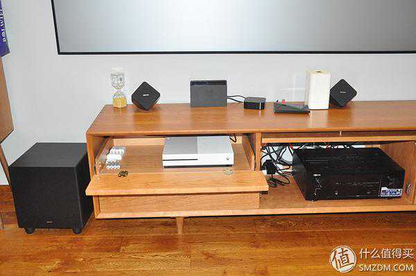 前置和中置音箱我就直接放在电视柜上了。