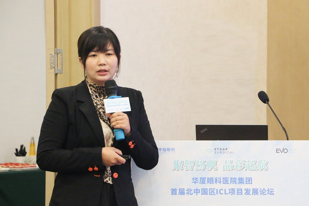 STAAR全国渠道销售总监刘娟现场致辞。她首先祝贺本次论坛顺利召开,对华厦眼科医院集团多年来在EVO-ICL项目领域中的贡献表示感谢。同时她也表示将进一步深入开展与华厦眼科医院集团的战略合作,全方位支持EVO-ICL项目的开展,为打造高清视界共同努力。