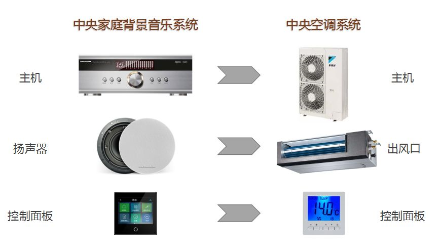 在形态上,你可以把它想象成中央空调,都是通过一台强大的中央主机来控制,中央音响的功放就相当于中央空调的主机,各个房间分区的音乐控制面板就相当于空调的温度调节面板开关,而扬声器相当于空调出风口。