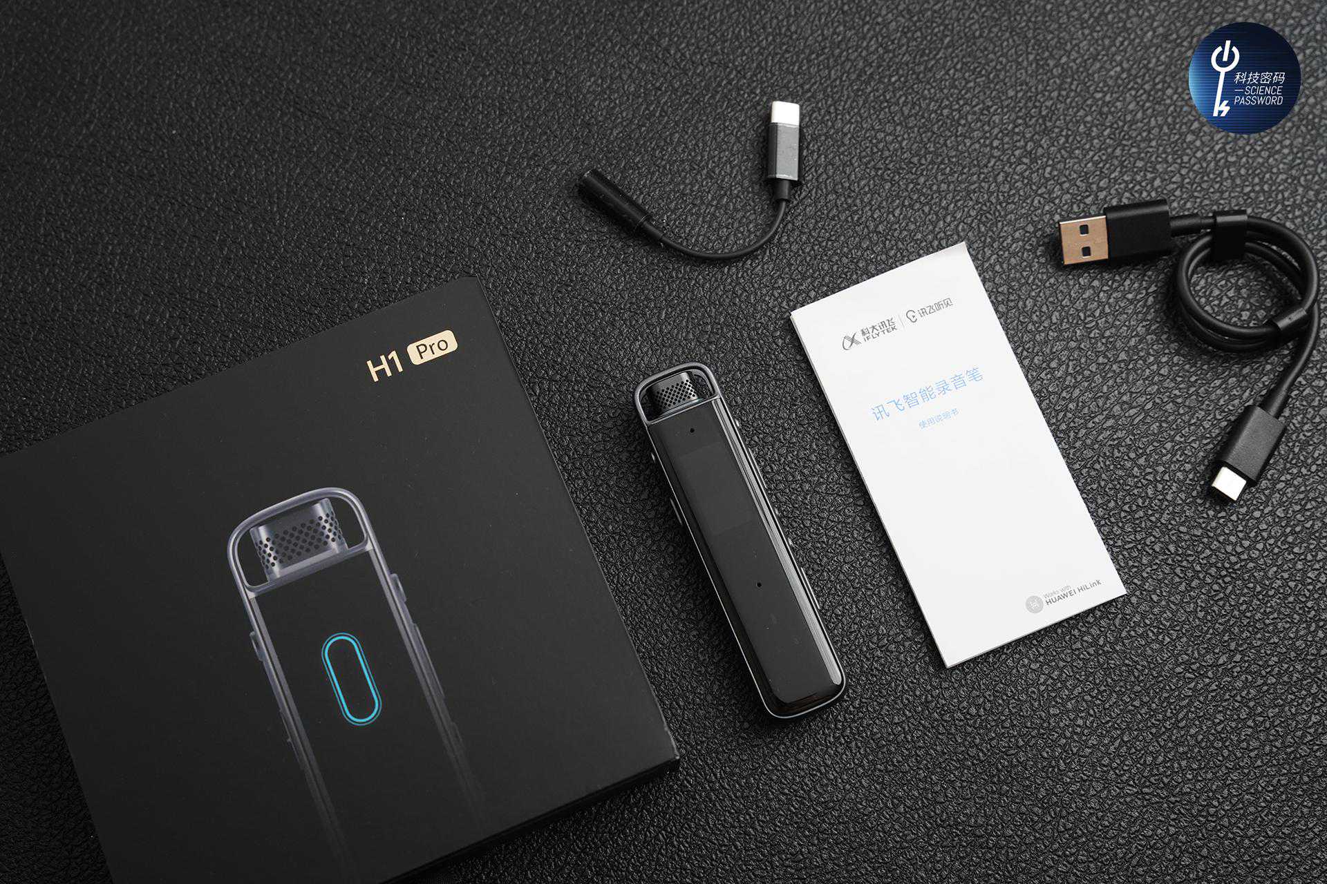 讯飞智能录音笔H1Pro包装盒为黑色设计,很有高级感,它的随机附带的配件有讯飞智能录音笔H1Pro、Type-C数据线、Type-C转3.5mm音频线、说明书、保修卡和合格证等。