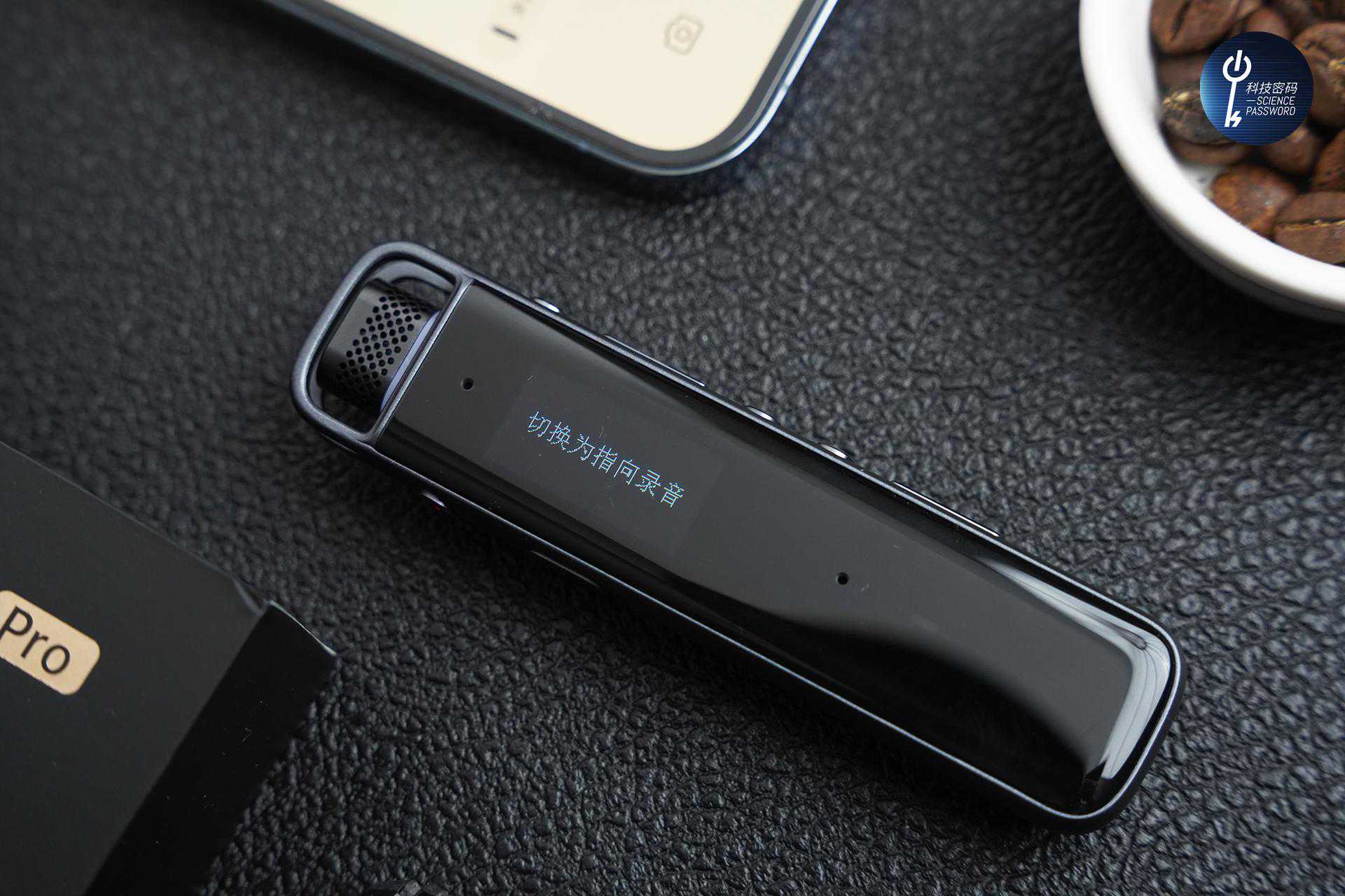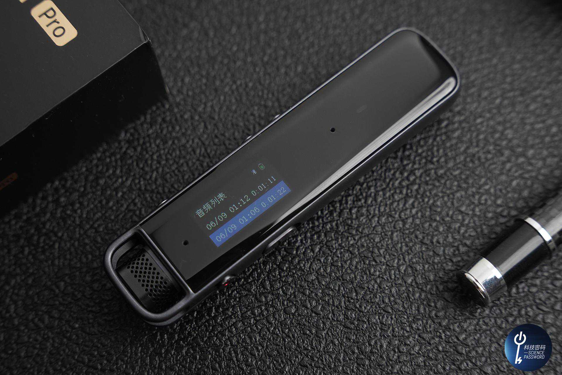 机身的正面是2.5D的玻璃设计,还有两个麦克风和录音指示灯。正面还内置了一块0.96英寸的显示屏,屏幕可以显示当前的录音状态,清晰明了。