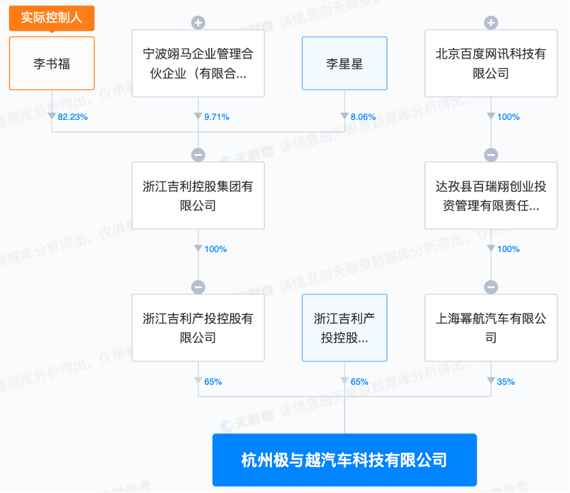 天眼查App显示,杭州极与越汽车科技8月9日成立,法定代表人为吉利控股集团高级副总裁张权,总经理为集度汽车CEO夏一平,注册资本1000万,经营范围含新能源汽车整车销售、汽车销售、汽车零配件零售等。该公司由浙江吉利产投控股有限公司和百度旗下的上海幂航汽车有限公司分别持股65%、35%。