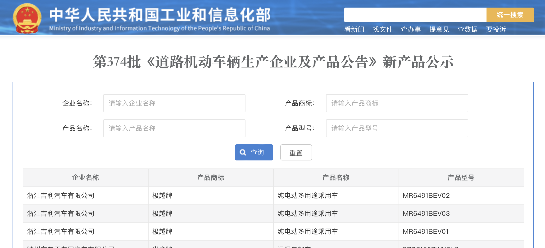 8月14日,工业和信息化部公示第374批次《道路机动车辆生产企业及产品公告》,其中被称为汽车机器人的车型榜上有名,产品型号共3款,名称均为纯电动多用途乘用车,产品商标为“极越牌”。这意味着,上述车型已具备生产资质,可以进入批量生产和市场销售。