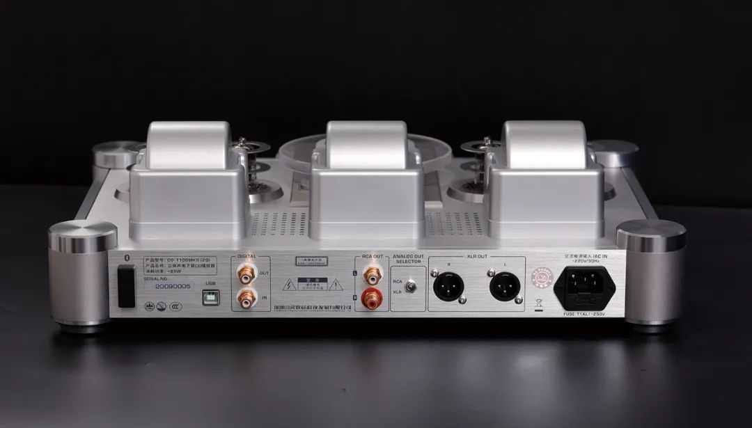 一直发展至如今的CD-T100MKⅡ限量版,依然维持了一贯的整体“胆机”式造型设计不曾改变。整体布局正中的掀盖式透明有机玻璃片舱很有未来感,工作时透出幽幽蓝光已经成为CD-T100系列乃至所有山灵高级播放机的标志。CD-T100SE之前的各代型号均使用PhilipsCDM1201机芯和CD-7II数字伺服电路。机芯左右两侧共四只电子管,型号均为6N3P,左边两只用于构成电子管输出电路,右边两只则用于构成电子管耳机放大器,耳机输出插孔也因此设在了底盘的右侧板上,这样可以将电流的传送路径减至最短。后排的屏蔽罩中分别安置着电源的滤波电感、电子管供电专用变压器、模拟音频电路专用变压器。而最新的CD-T100MKⅡ限量版取消了耳机口(耳放线路),而这对12AU7电子管用作XLR平衡输出线路。此为CD-T100MKⅡ限量版区别于以往各代产品的元素之一。