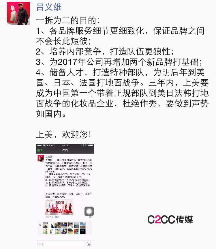 此外,企业裂变也意味着人才的不断裂变,这是解决企业持续发展的关键。同理,上美此次“裂变”,亦需要更多优秀的人才。“上美为你提供有名、有趣、有利的舞台,欢迎才华横溢的你加入。“吕义雄开始在朋友圈招兵买马: