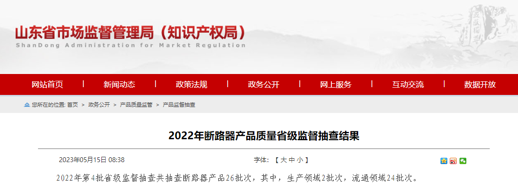 中2023年5月15日,山东省市场监督管理局网站公布2022年断路器产品质量省级监督抽查结果。