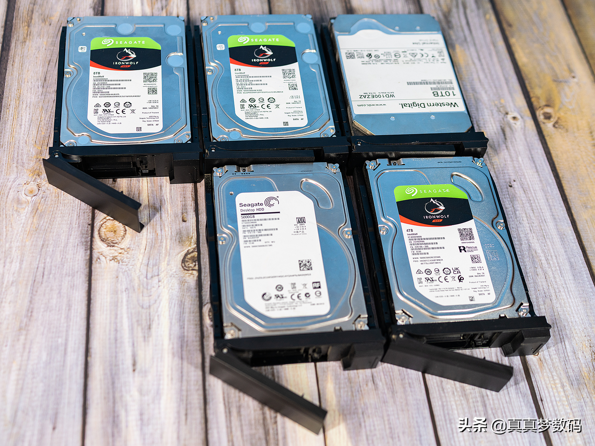 9块盘的灯都点亮了,这种多盘位又便宜的NAS正好适合我这样手上有一些淘汰又舍不得扔的硬盘的用户: