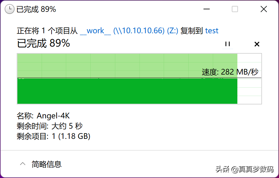 TVS-951N提供了一个5G网口,只是家里的路由器、交换机和电脑目前都只支持2.5G网络,NAS的传输速度被限制在2.5Gb,不过也比918+的千兆网络快一倍多了,备份、取回数据时可以节省大量的时间;我从NAS上取回一个电影到电脑本地磁盘,在windows下原生2.5G网口测得传输速度稳定在280MB以上。当然这是从SSD盘传输到本地的速度,机械硬盘的话有些盘读取速度可能是达不到280MB/S的: