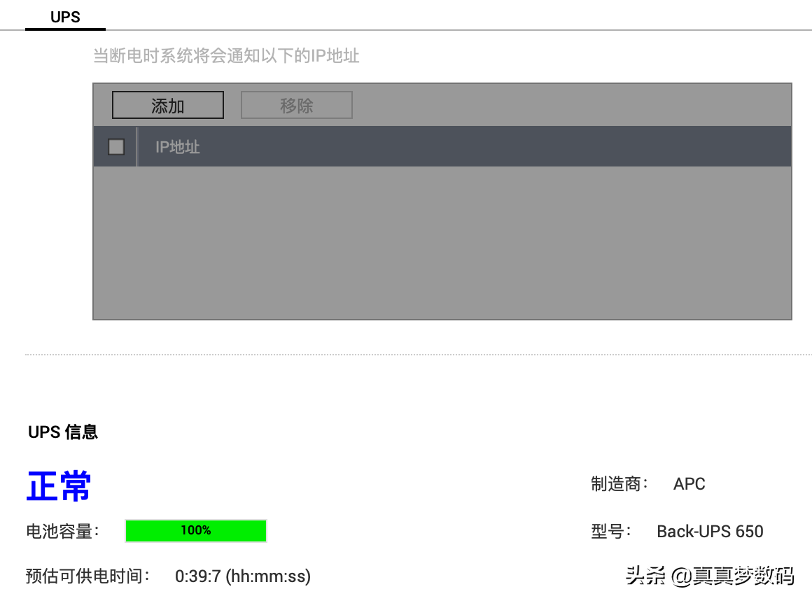再提一下由于NAS有9个盘,建议搭配UPS电源使用以保证数据和硬件安全。实测我的老APCBK650可以完美支持951N的,停电后在一定时间里NAS会自动关机: