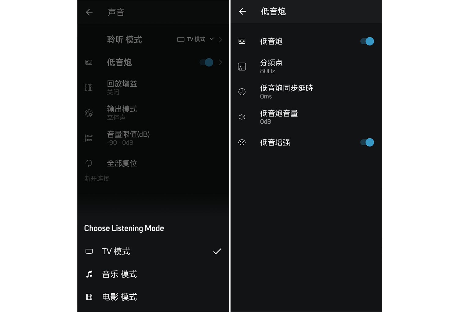 在音效设置方面,BluOS除了支持高音模式和Bass调节以外,还能选择回放增益、调节音量限值等,直接在预设的TV、音乐和电影等三种模式中切换。
