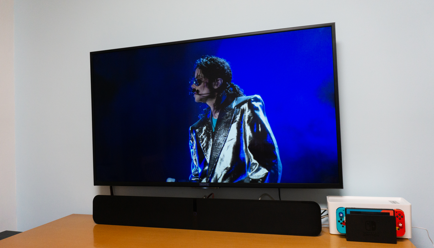除了正常的观影外,家庭影院组群后欣赏Live版的音乐影音也不错。在播放MichaelJackson的彩排影像时,人声部分清晰并相当有穿透力,背景乐有层次感,左右声道均衡。