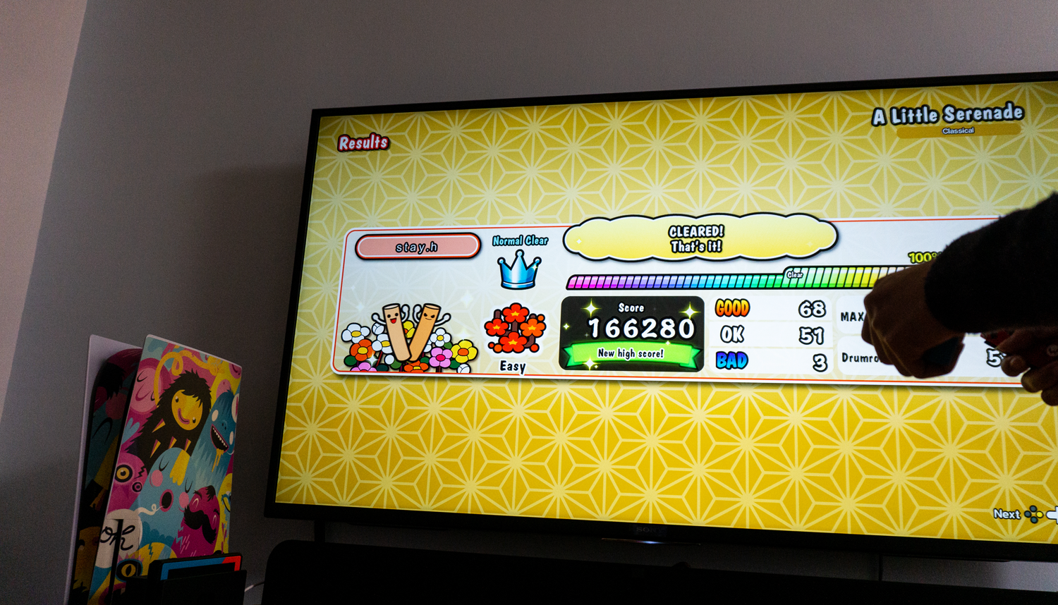 其实就算不是3A大作,只要连接上回音壁都会比较明显地有加成。就以Switch上的《太鼓达人》为例,鼓点声会比只用电视音响输出时更突出,手柄随鼓点声敲击,声音上无任何延迟,连击进入白热化后再配合BGM响起,氛围瞬间拉满,音乐性越强游戏体验也更优。