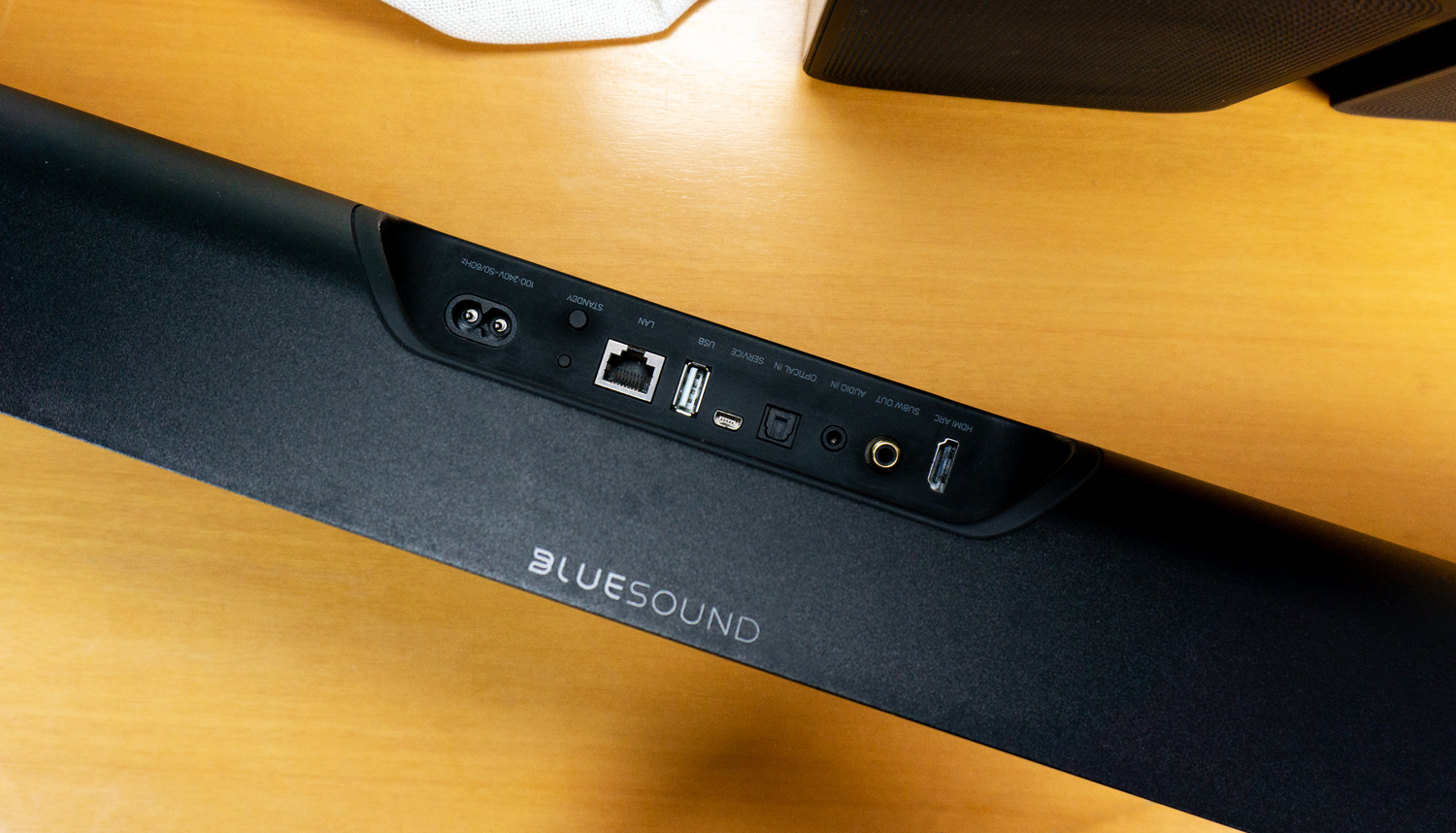 音箱的所有接口与按键均集中在背面中部,呈一字排列。接口上除了电源插口和HDMIARC接口以外,还配备了光纤口、低音接口、USB-A插口、LAN网络口以及SERVICE调试。接口方面较齐全,能适应各种输入环境。