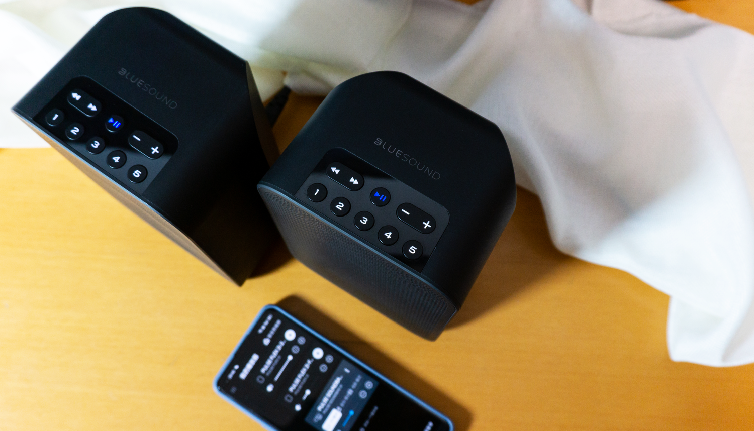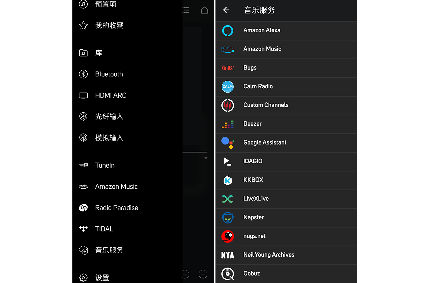 BluOS的主界面十分简洁,主桌面为当前播放状态,可控制播放/暂停。通过左右向内滑动,可弹出相应的菜单。左侧是信号输入和播放媒体选择,右侧是音箱声音模式的切换和添加新的产品,操作逻辑上很容易上手。