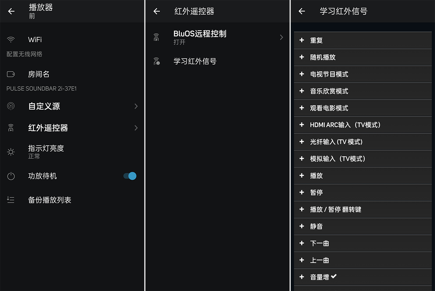 值得一提的是,尽管PULSESOUNDBAR2i和PULSEFLEX2i没有提供遥控器,但我们却可通过“红外遥控器”选项,以学习的方式自行同步遥控器功能,例如我现在就是用电视遥控器在同步调节PULSESOUNDBAR2i音量大小。