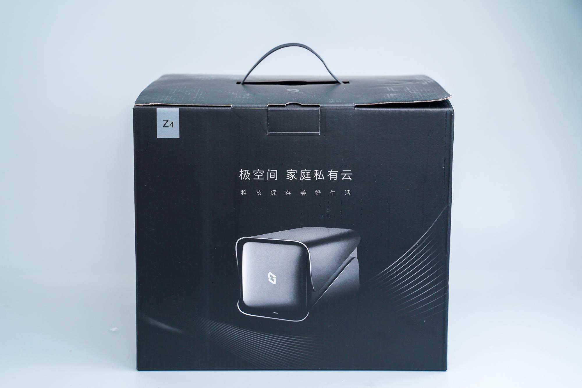 1、极空间Z4的外包装也和其它品牌NAS的牛皮纸风格不一样,采用了黑色的包装盒: