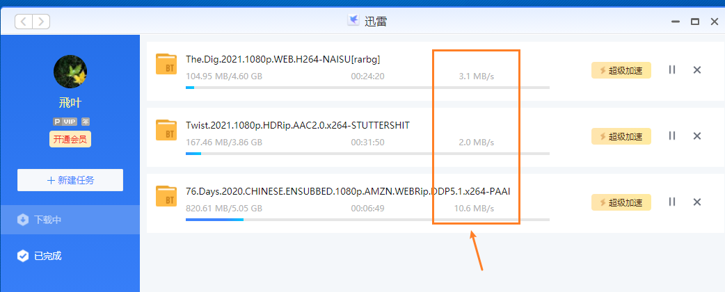 PT的下载速度受限于种子热度,如果下热种,很容易就能下满宽带速度: