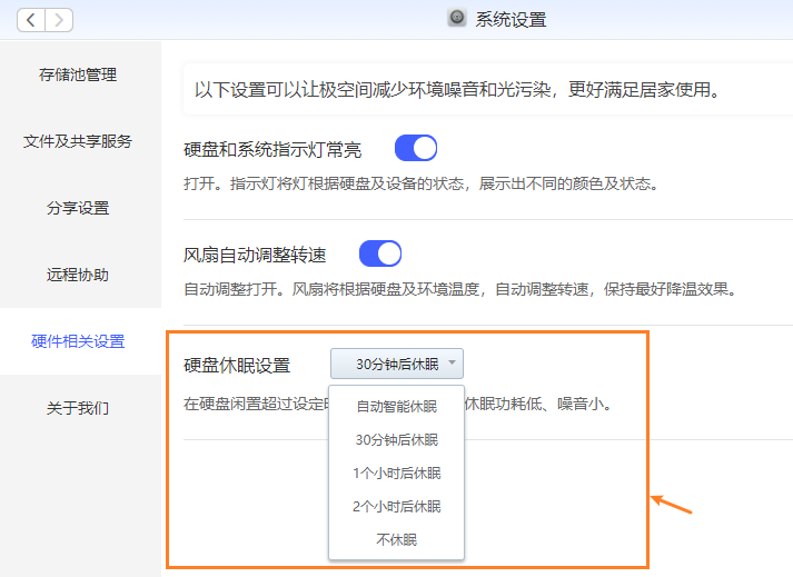 2、特别是,极空间的系统设置中,还有硬盘休眠的设置,大家可以设置硬盘闲置多久的时间后,开始进行休眠: