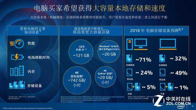 那么目前用户所使用的硬盘是一个什么状况呢?相关的市场调研数据显示,台式机有71%的用户采用机械硬盘,24%采用固态硬盘,5%用的是机械+固态硬盘的组合。笔记本用户有32%用的是机械硬盘,49%用的是固态硬盘,机械+固态的组合仅有1%。