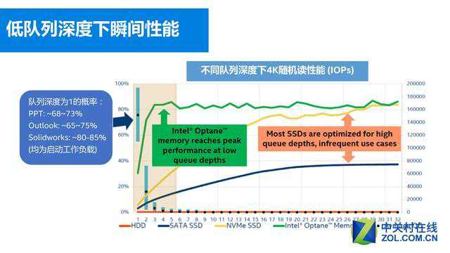 第四,3DXpoint可以在极小的队列深度下达到性能峰值。通过上图可以看到,绿色的傲腾内存在4队列深度以下就已经达到了性能峰值,并且非常稳定。而PCIe、SATASSD则需要在更深的队列深度下才能发挥全部性能。而事实情况是,我们日常用到的大多数软件的队列深度一般都不超过4。比如PPT有68%-73%的概率队列深度为1,Outlook有65%-75%,SolidWorks则有80%-85%。
