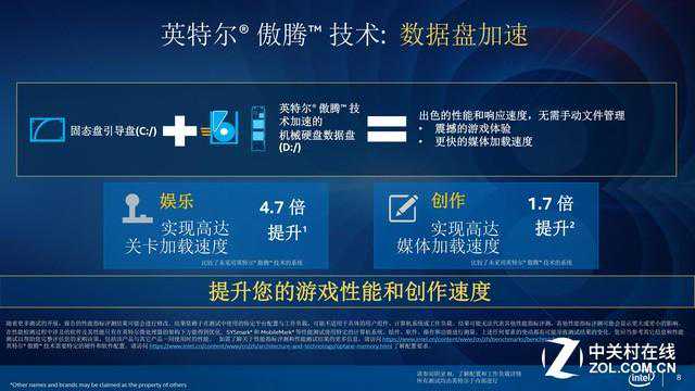 使用双盘的用户大多数是用SSD装系统,机械硬盘装游戏、应用,这种情况下加速系统文件是更快了,但是加速游戏或者应用的时候依然是机械硬盘的读取速度,如果把傲腾内存和安装游戏、应用的机械硬盘相组合的话,在加载这些游戏、应用的时候就会有一个明显的速度提升。按照英特尔的说法,加载游戏关卡时的速度提升可以达到4.7倍,加载创作类应用文件时的速度提升可以达到1.7倍。