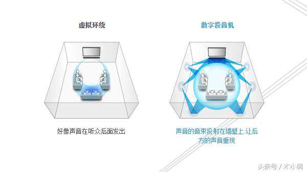 虚拟环绕声是把环绕声道的信号以一定比例混入左右声道,营造更加空旷的效果,但同时也会让声音更加浑浊,实际上也听不出包围的感觉。而雅马哈的数字投音机技术则实现了真正的环绕立体声,有着质的区别。但是这套设备对房间要求较高,最好是对称的房间,墙面没有吸音材料,否则效果会大打折扣。但现在多数人是在客厅安装家庭影院,而客厅通常与餐厅连通,还有通往阳台的大门,往往无法完美发挥它的功力。