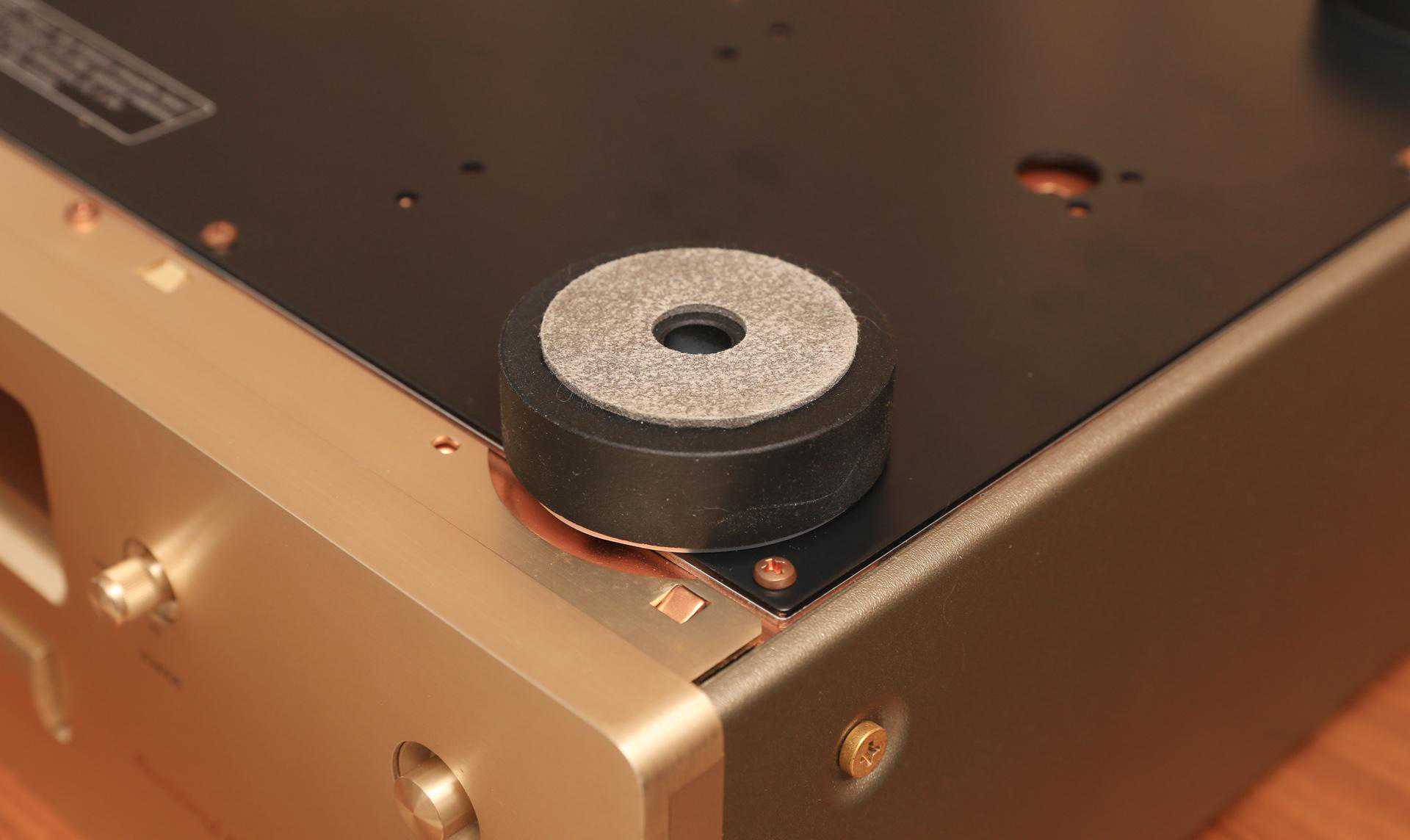 托盘部分使用了镀铜金属板隔离以期得到更好的屏蔽与避震效果。其实这种小心思在细节部分依然可以见到,比如说那两片灰色的阻尼物,将机体与上盖隔开,起到更好的避震效果。