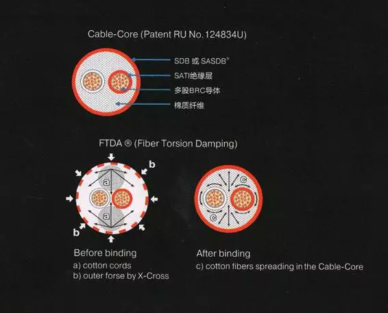 切尔诺夫专利的Cable-Core与FTDA(螺旋包覆阻尼技术)用在经典系列与顶级的Ultimate系列。运用多种不同材料的屏蔽层来隔震避震,并减少热能引起的电器特性变化