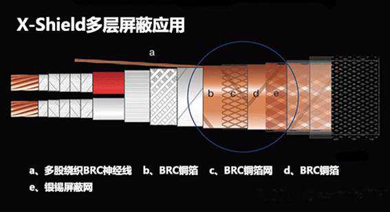 切尔诺夫开发的X-Shield专利屏蔽技术,使用完全对称的芯线结构,多股BRC芯线外先用多层PTFE材料绝缘,屏蔽层用超90%的BRC铜箔与铜编织网构成,最外面保护层再用双层防静电SPVC材料,复杂但是有效
