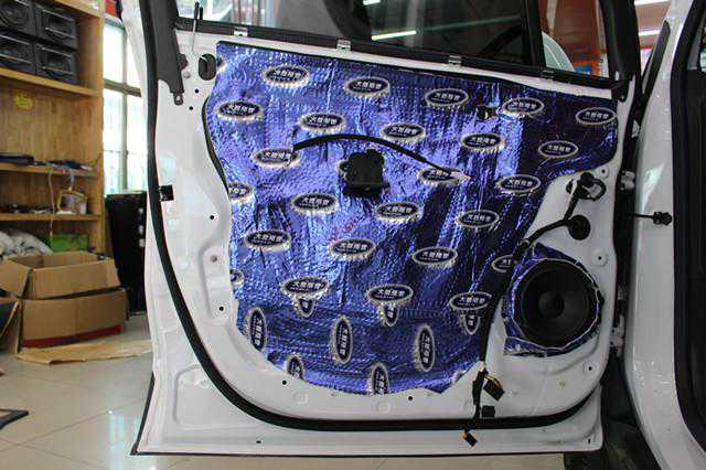 接着对门板进行隔音施工,车门隔音使用大能蓝金刚进行内外层隔音,能够增加钣金厚度增强车门钣金刚性,降低行驶时因金属薄弱产生的共振,以及长期坎坷路面行驶下因金属疲倦产生的杂音,更好的止震降噪,同时形成密封箱体,更好的展示音响的音色音质!