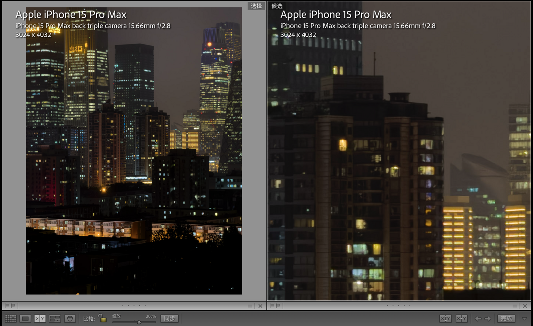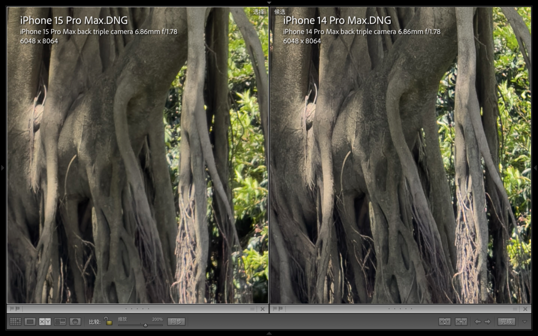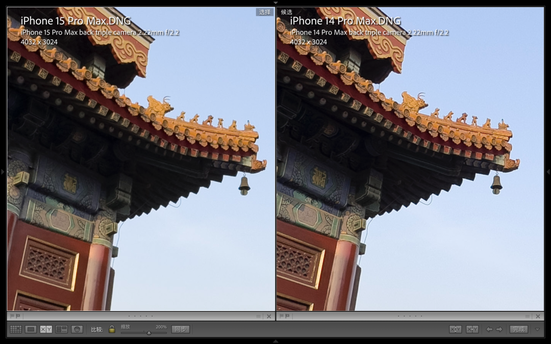在白天光线充足的环境下,我们实际对比两台手机的主摄拍照效果,两台手机均拍摄的是4800万像素RAW照片。我们可以发现,两组样张放大后可以明显看出iPhone15ProMax相比上一代的锐化程度有所降低,尽管放大到200%观察细节锐度没有iPhone14ProMax那么夸张,但实际上缩小到实际大小的时候观感要更好一些。
